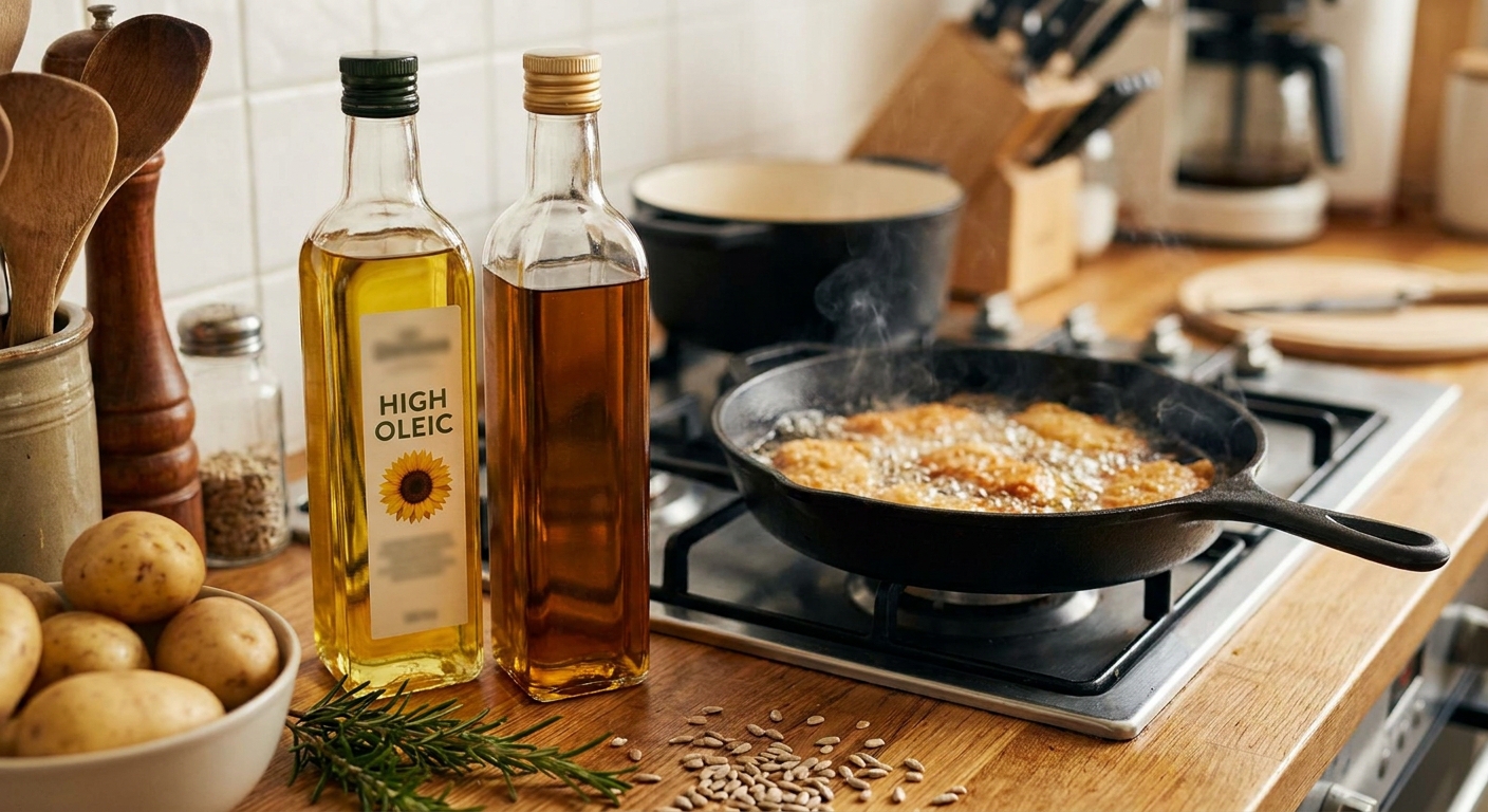 Existuje i jiná varianta, označuje se jako high oleic slunečnicový olej. Má jiné složení, víc mononenasycených tuků a ty jsou při teple stabilnější. Není to jen nějaký marketing, rozdíl je fakt v chemii.