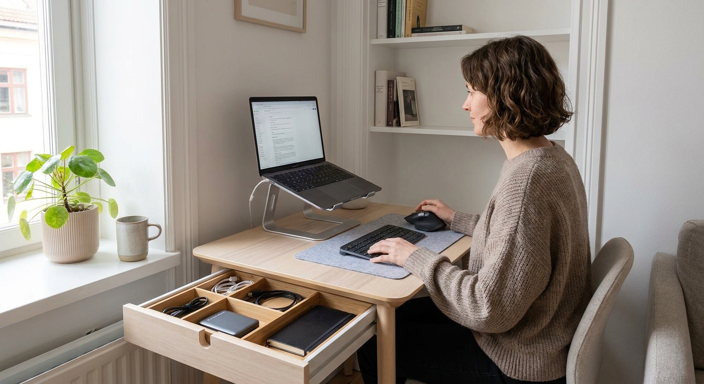Klasický pracovní kout tak pomalu ustupuje. Nastupuje spíš flexibilita a improvizace. Notebook, skládací stojan, bezdrátová myš, malý organizér. Všechno se dá uložit do jednoho šuplíku nebo krabice. Po práci zmizí a byt zase funguje normálně.