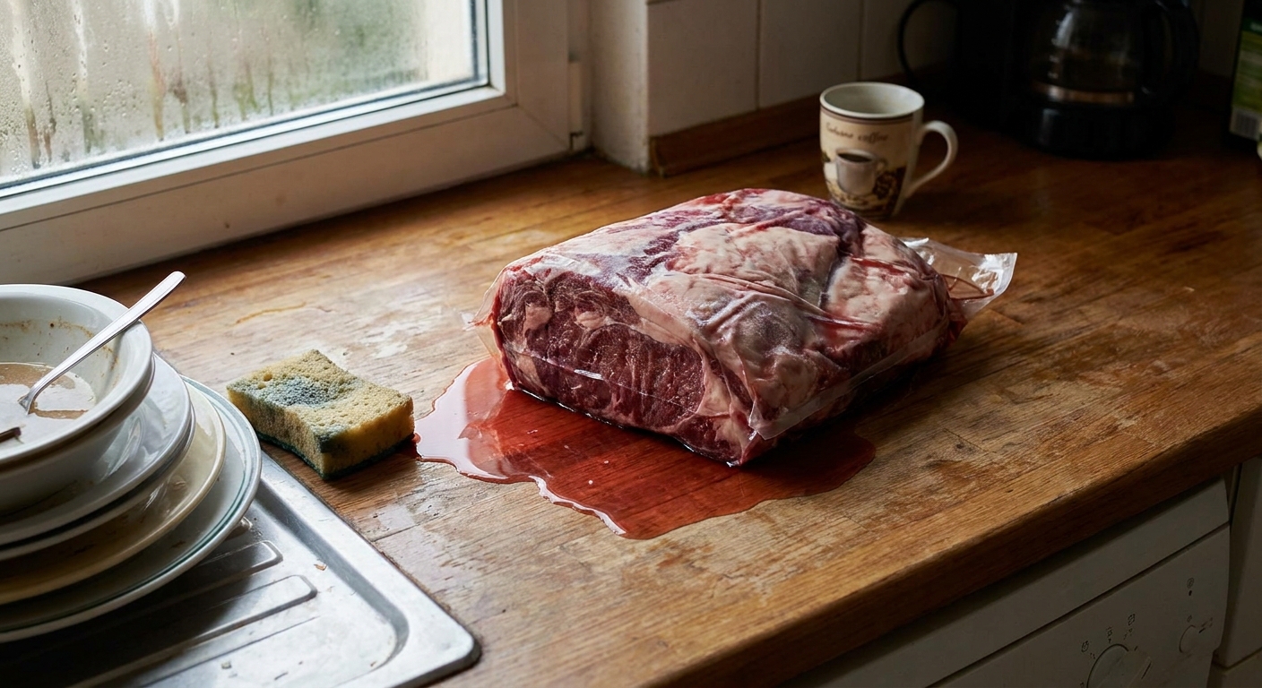 Další problém je takzvaná křížová kontaminace. Jednoduše řečeno, bakterie se z masa dostanou na jiné potraviny nebo povrchy. Když maso odtává na lince, šťáva může potřísnit prkénko, nůž nebo třeba ovoce vedle. A právě tohle nenápadné šíření bývá dost častý zdroj potíží.