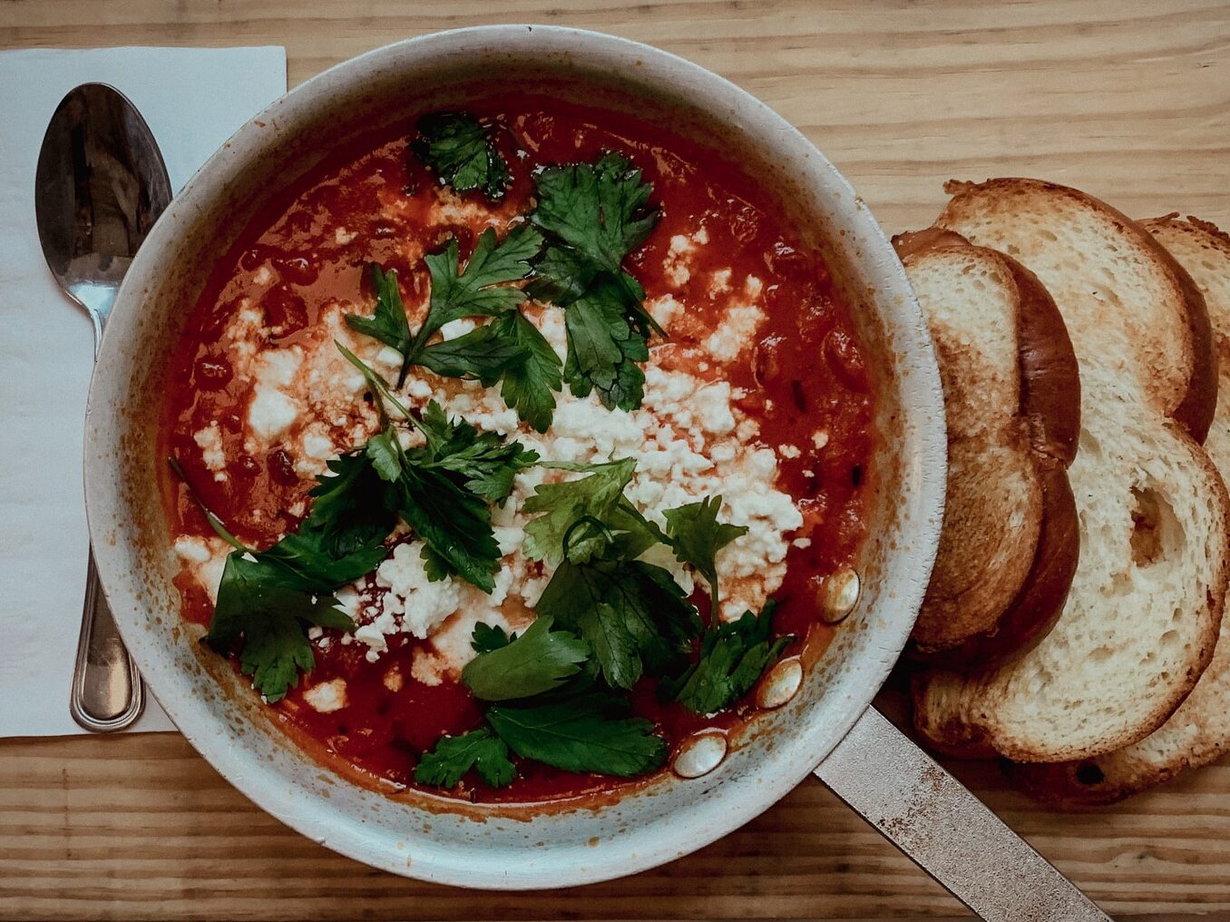 - Pomocí kuchyňských chňapek přeneste horkou pánev na teplovzdorný povrch, například na sporák. Navrch dejte rozdrobenou fetu, lístky čerstvého koriandru a případně ještě vločky červené papriky. Podávejte v miskách s křupavým chlebem po straně.